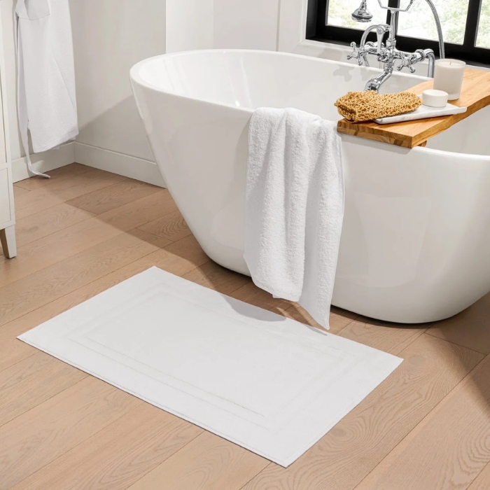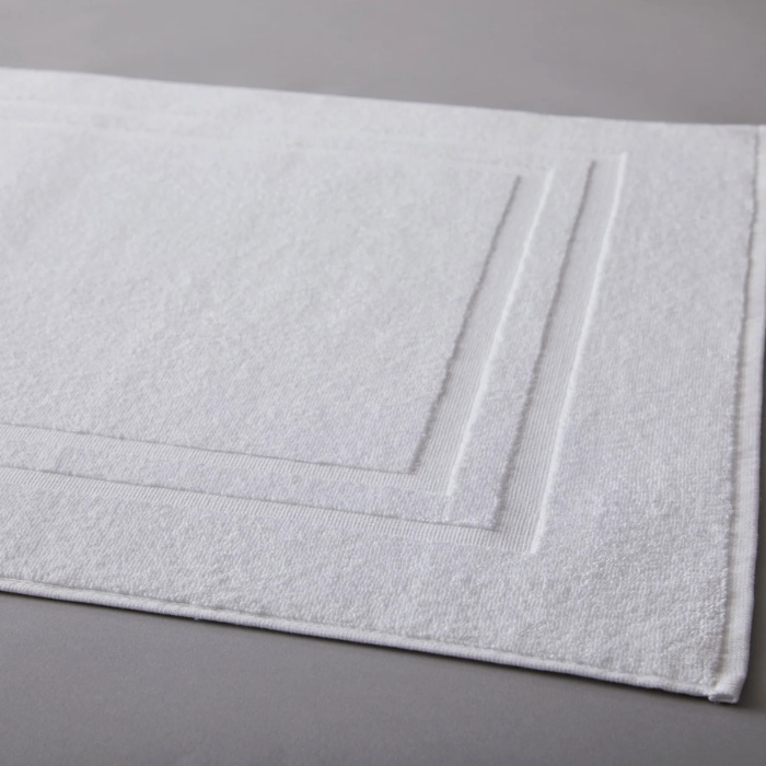 The Single Border Bath Mat is 100% cotton, super soft and lofty, extra absorbent and features a classic woven double border detail.